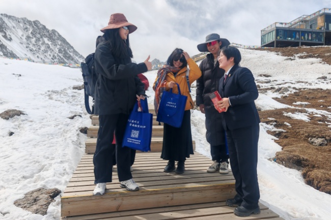 甘肃省肃南裕固族自治县检察院干警在巴尔斯圣山生态旅游景区内开展普法宣传,为景区游客答疑解惑。